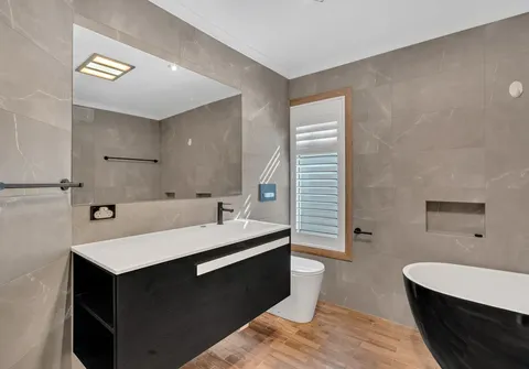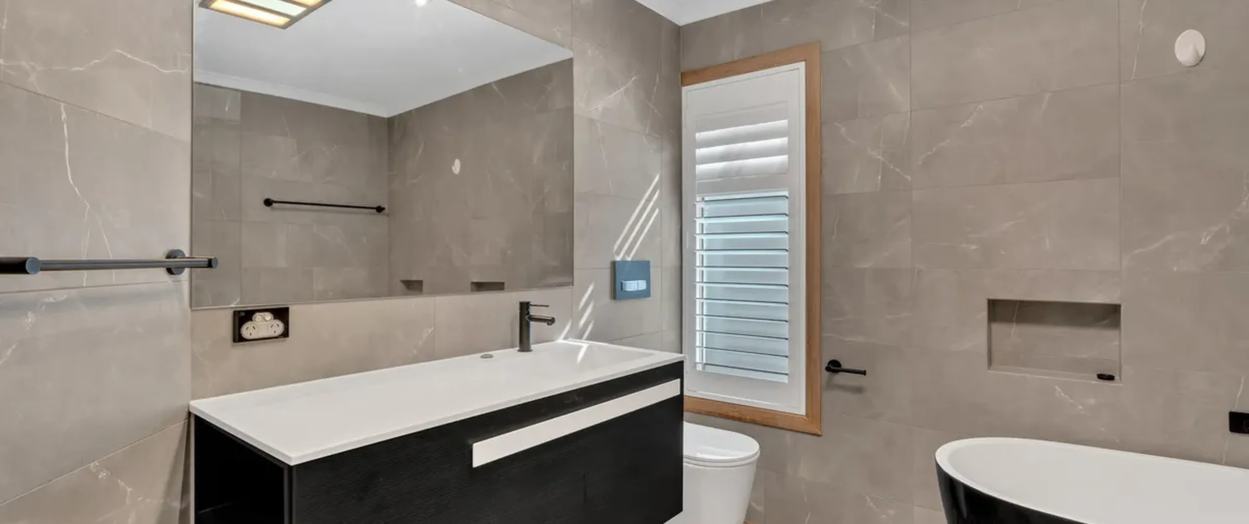 - Modern main bathroom with floor-to-ceiling tiles, freestanding bath, semi frameless shower, toilet, large floating vanity with additional storage below and plantation shutters