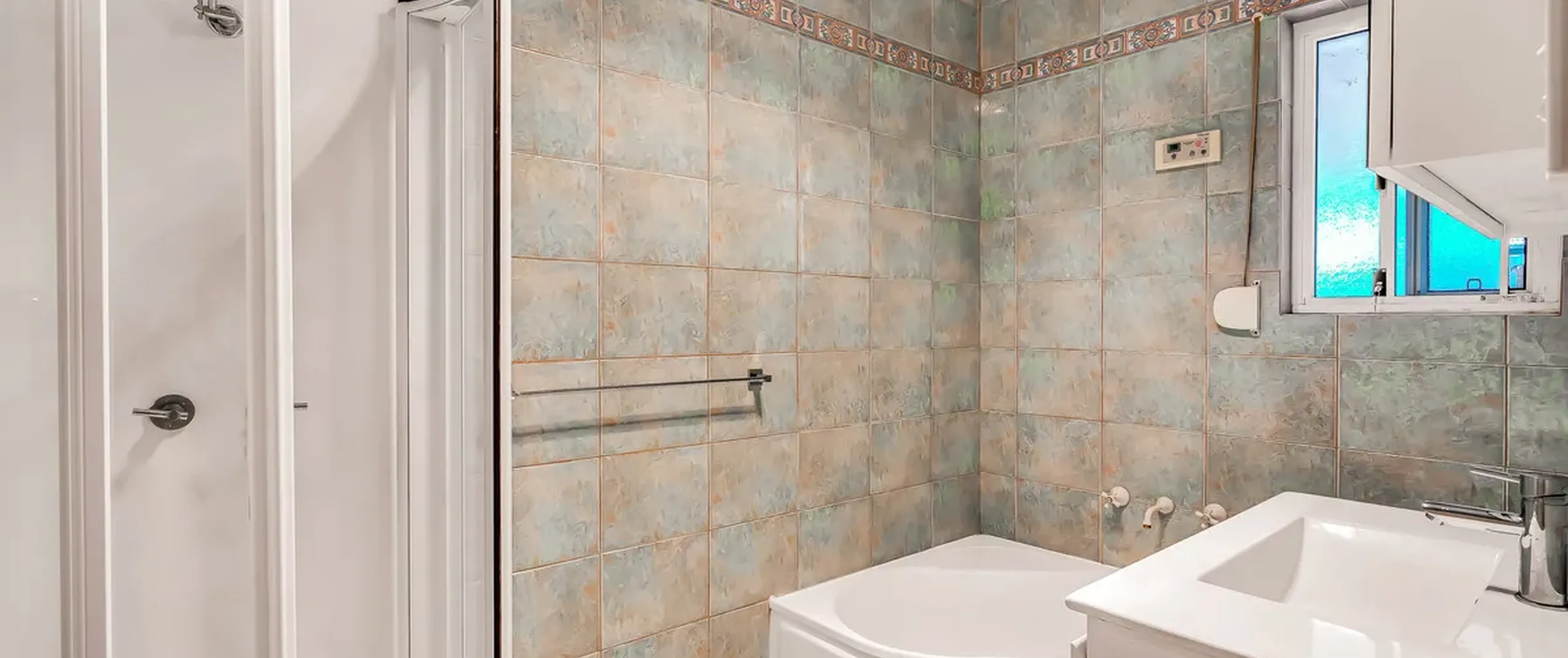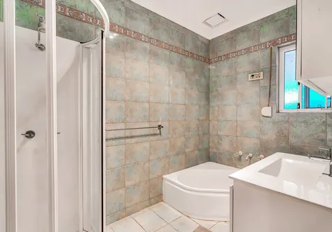 - Main bathroom with floor to ceiling tiles and separate bathtub