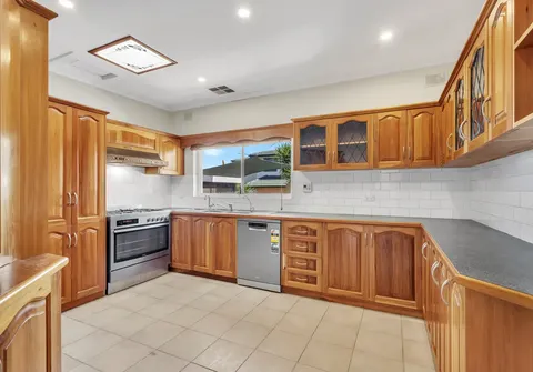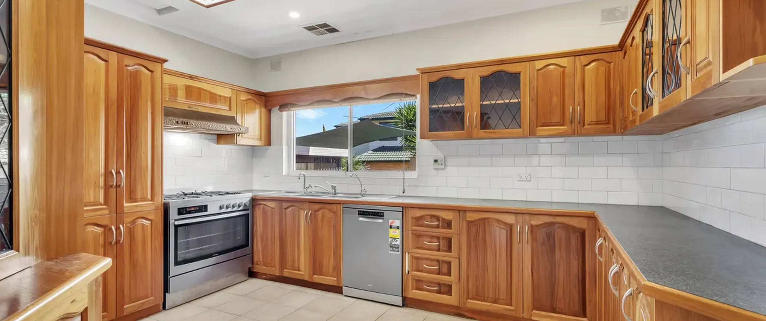 - Traditional kitchen with wooden fixtures, stainless steel dishwasher and oven, complete with generous bench and cupboard space