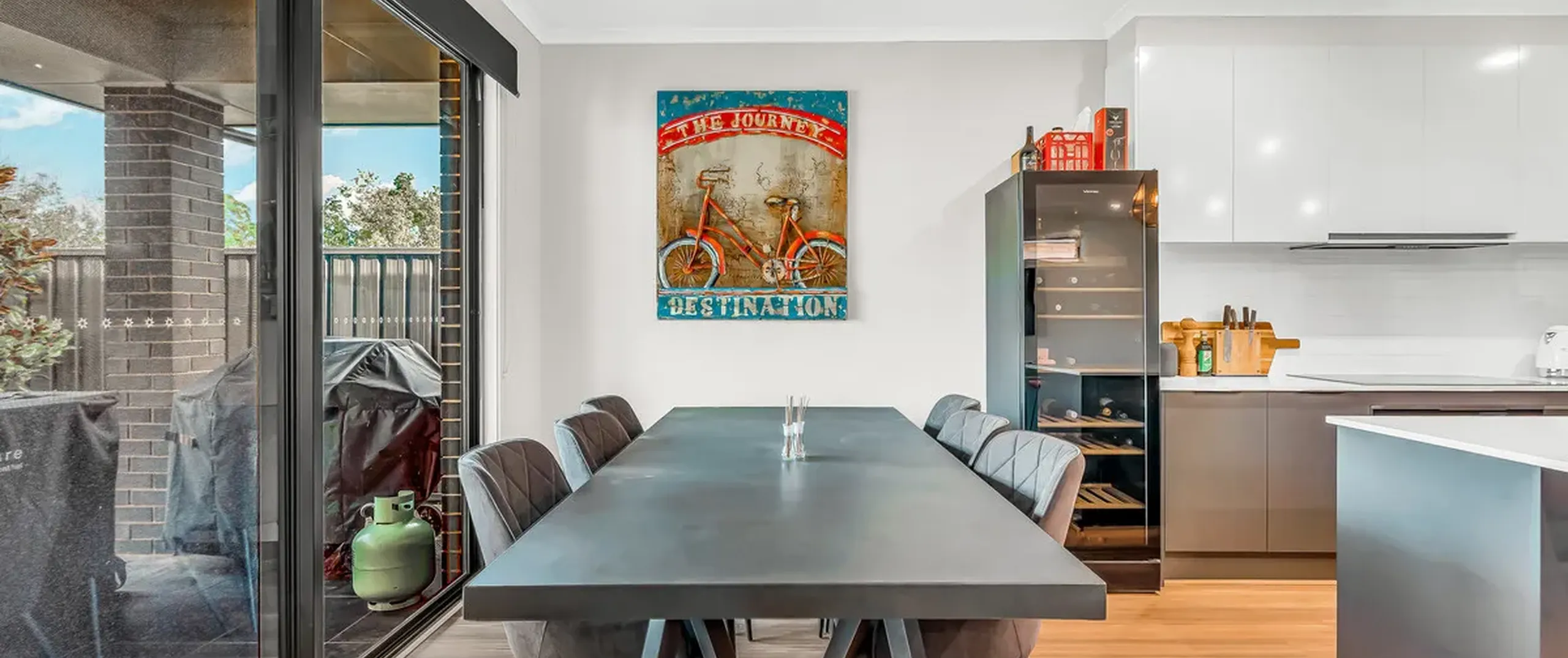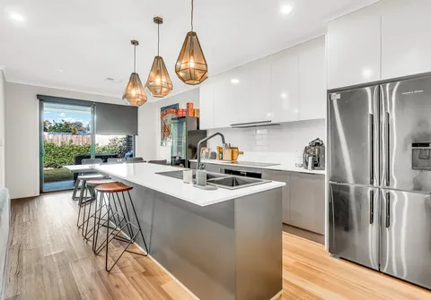 - Sleek on-trend kitchen with stone bench tops, dishwasher, 900mm induction cooktop, and 900mm oven with feature tiled splash back, ample cupboard, and bench space complete with breakfast bar