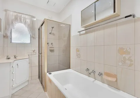 - Neat and tidy main bathroom with corner shower, separate bathtub and vanity with below storage