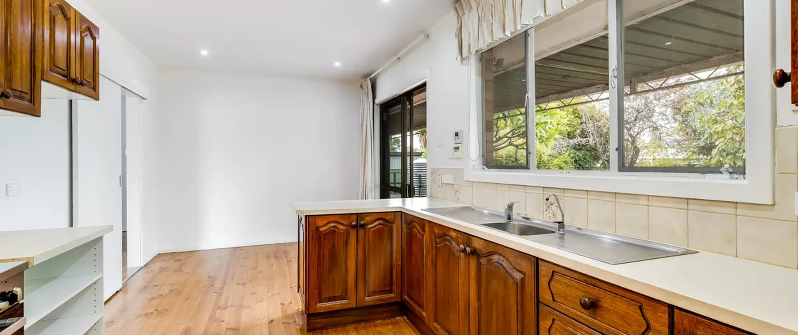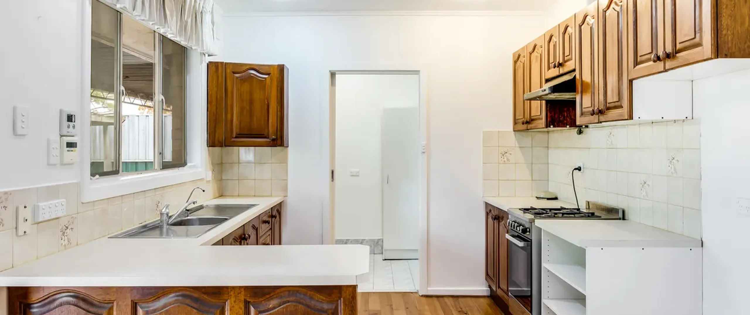 - Practical kitchen boasting gas cooking, oven, double sink and ample cupboard and bench space