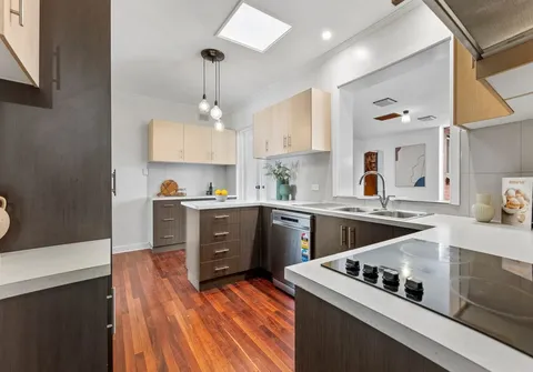 - Central modern kitchen featuring good bench top space, skylight and pendant lighting, abundant cabinetry and cupboards, as well as stainless appliances, including dishwasher and sleek electric cooktop