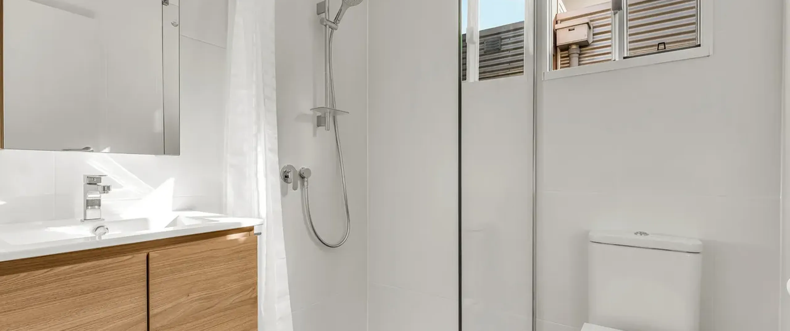 - Sparkling main bathroom with floor-to-ceiling tiles and shower