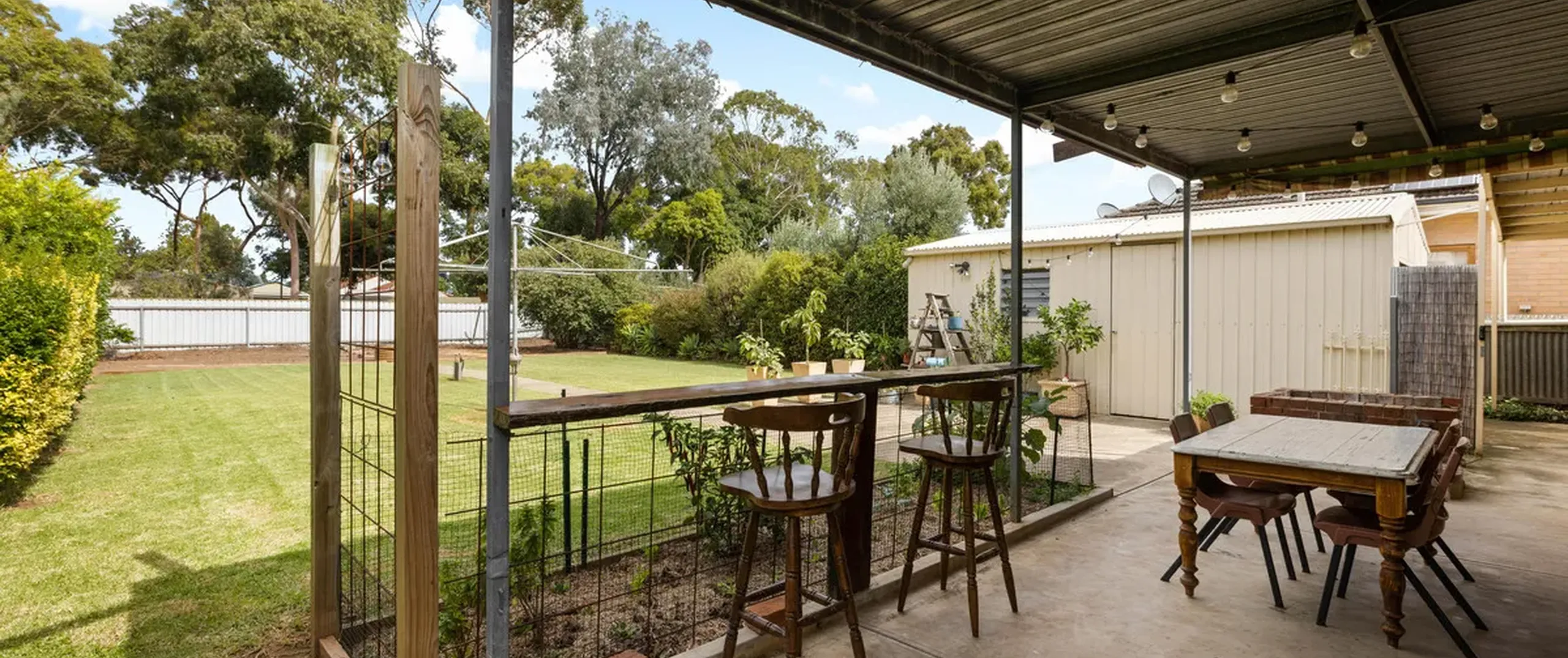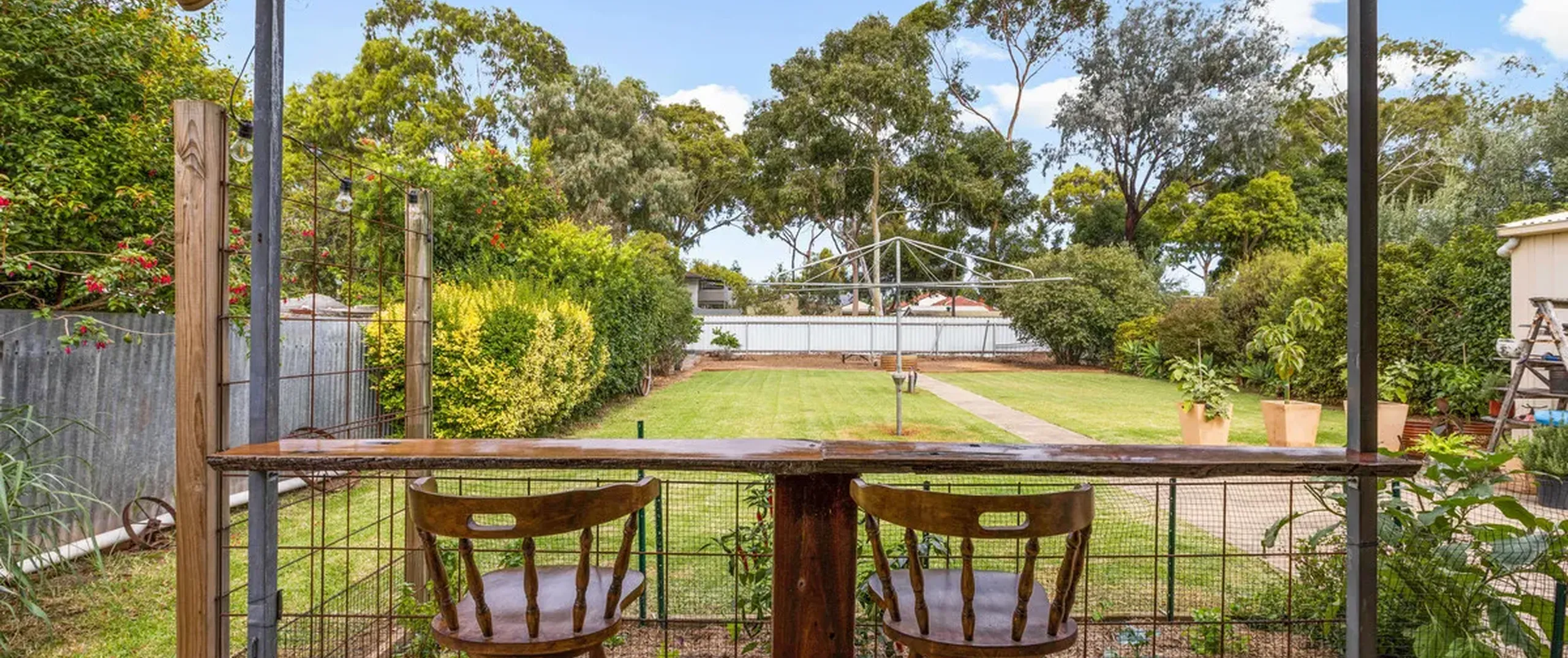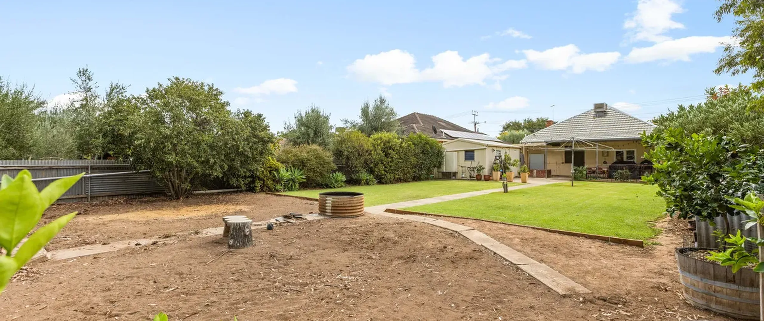 - Large backyard with rainwater tanks and established gardens