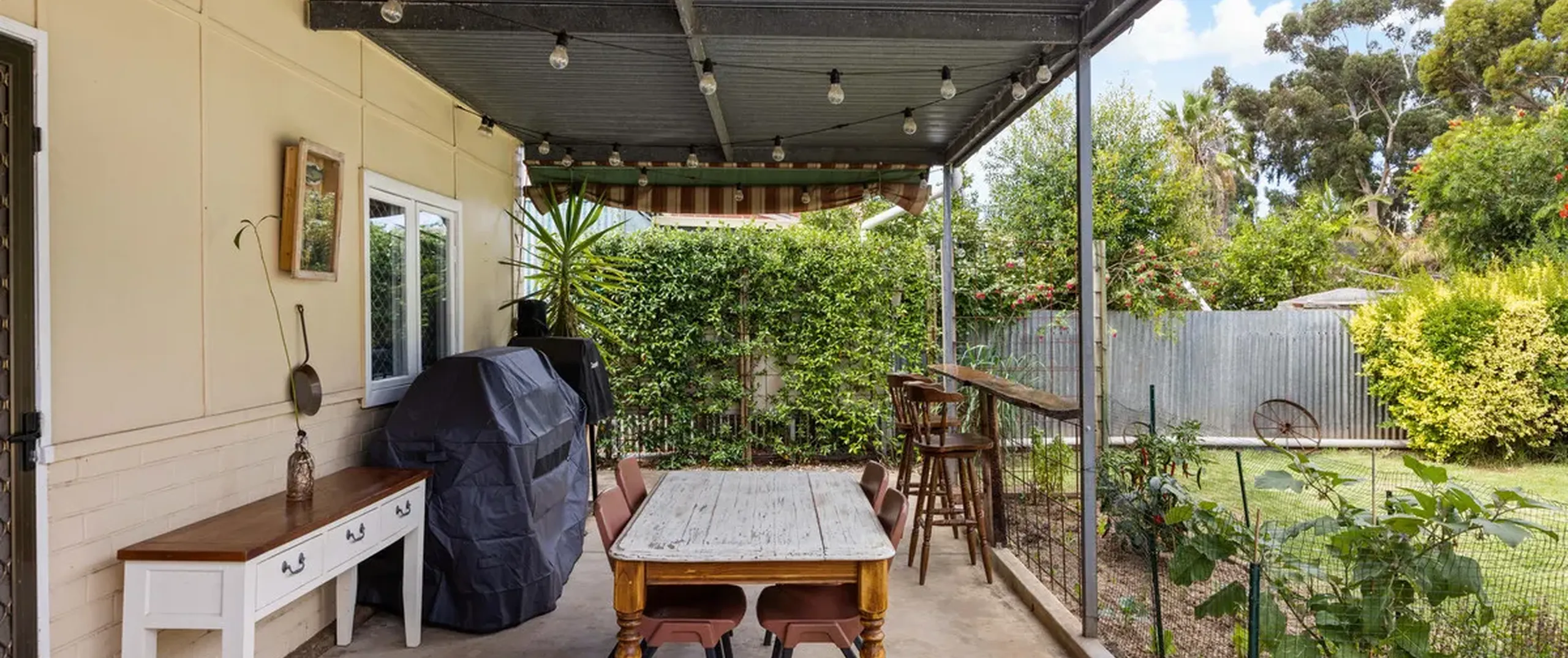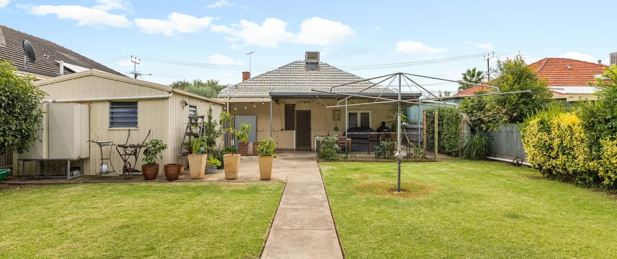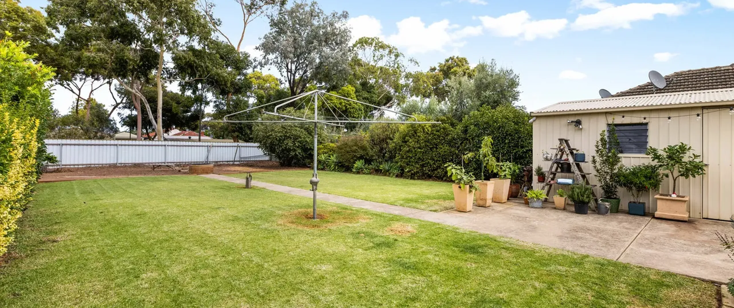 - Large backyard with rainwater tanks and established gardens