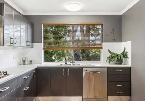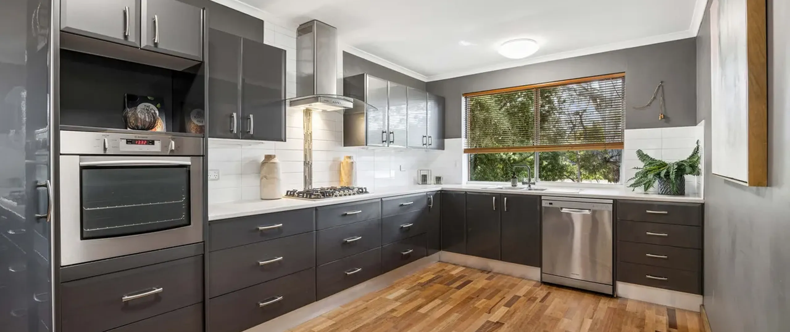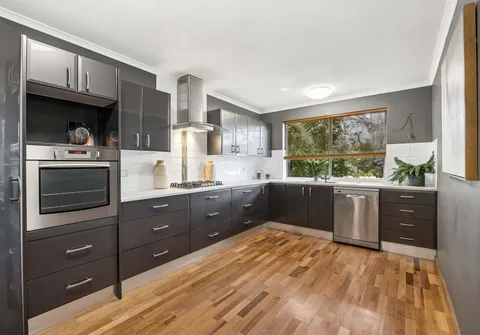 - Modern kitchen complete with stainless steel appliances including gas cooking, dishwasher, oven and ample cupboard and bench space