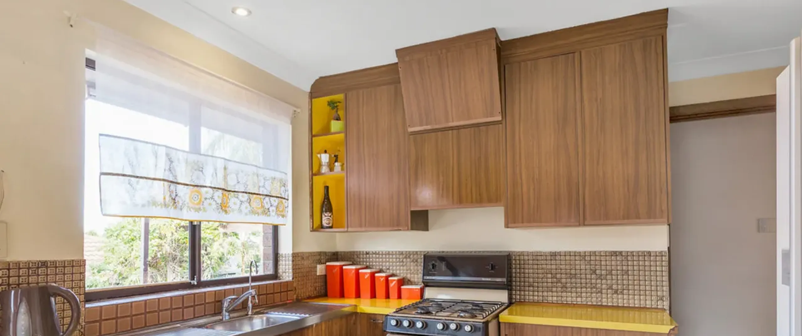 - Retro style kitchen with gas cooktop, overlooking dining area