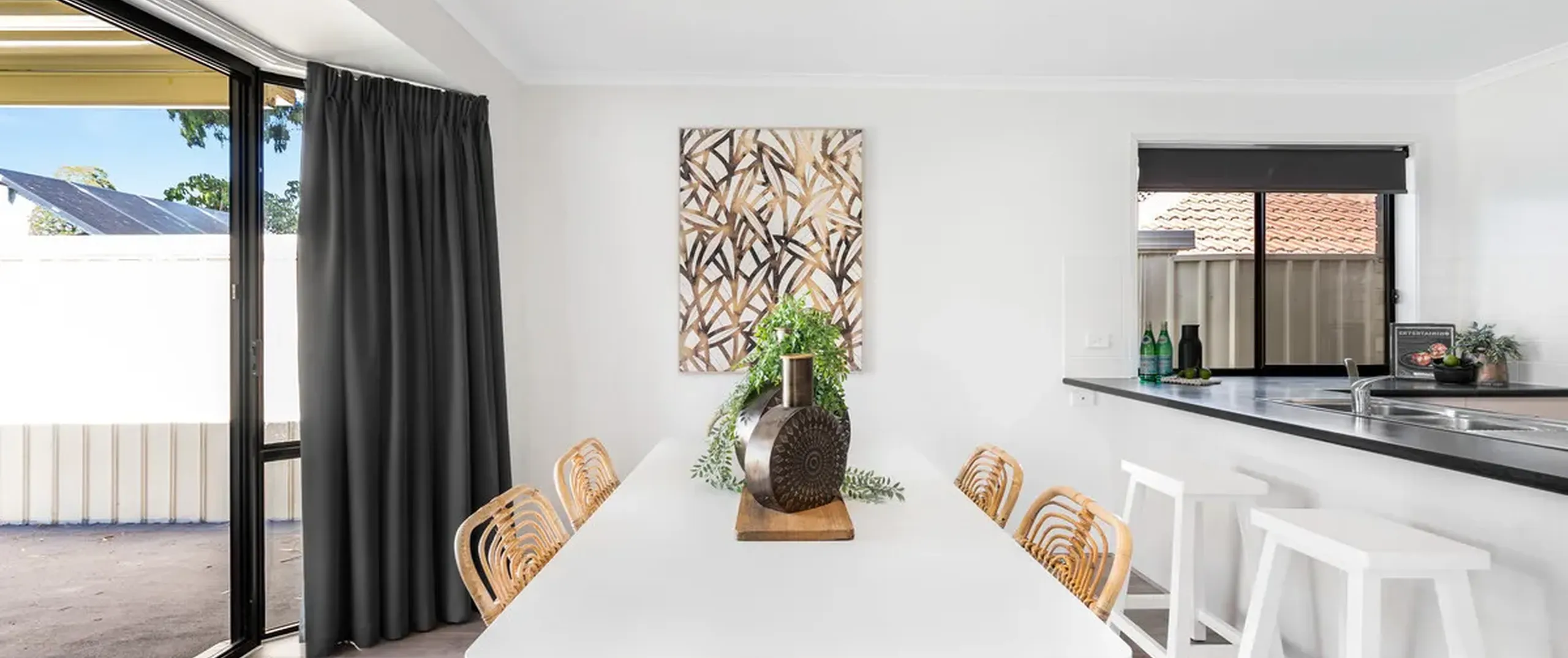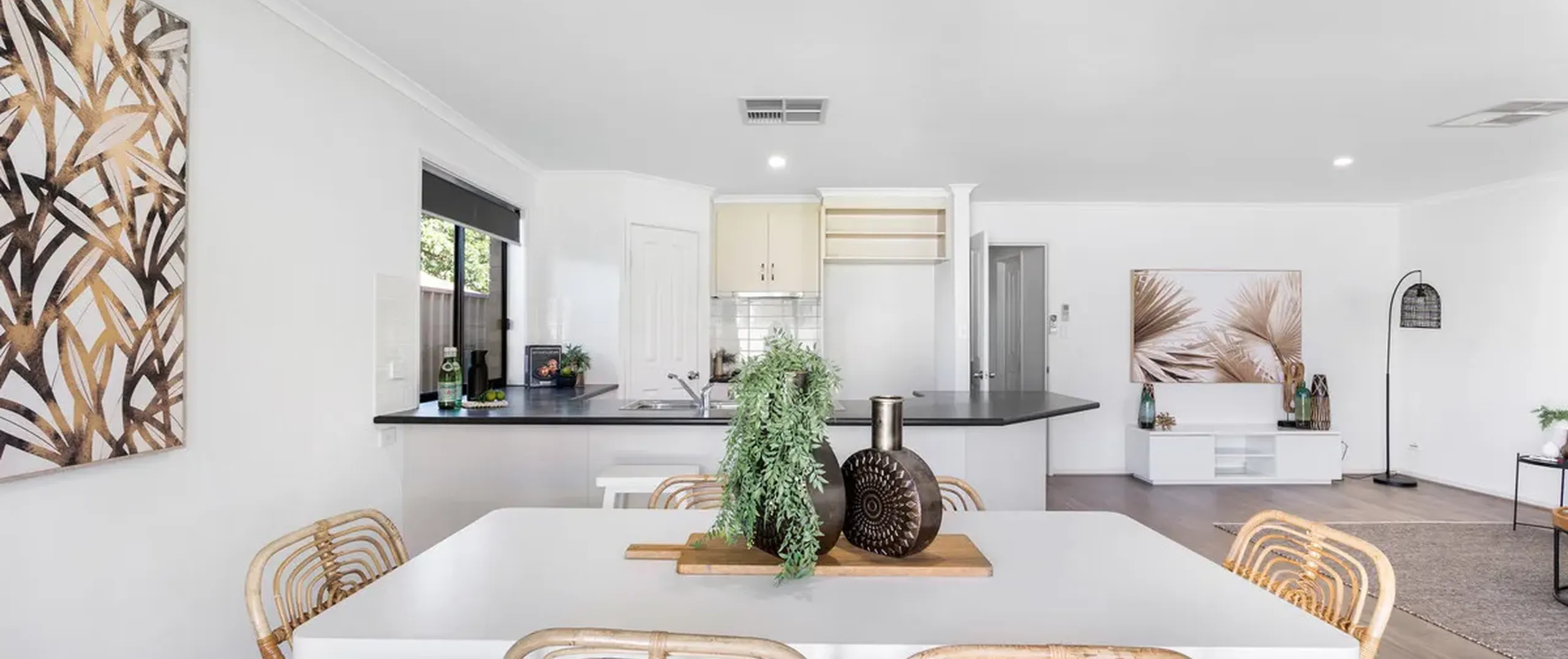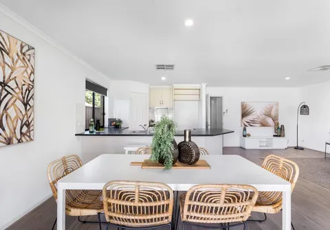 - Spacious and light-filled open-plan living, dining and kitchen with split system air conditioner and sliding glass door leading to the outdoor verandah