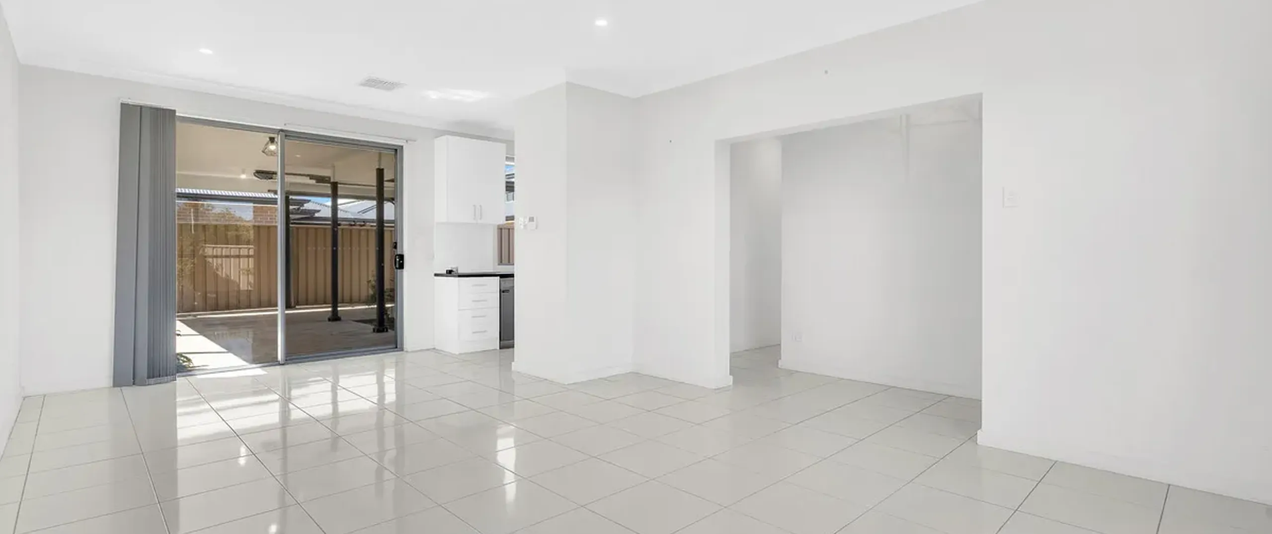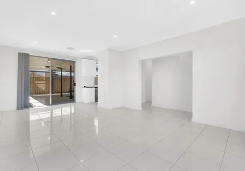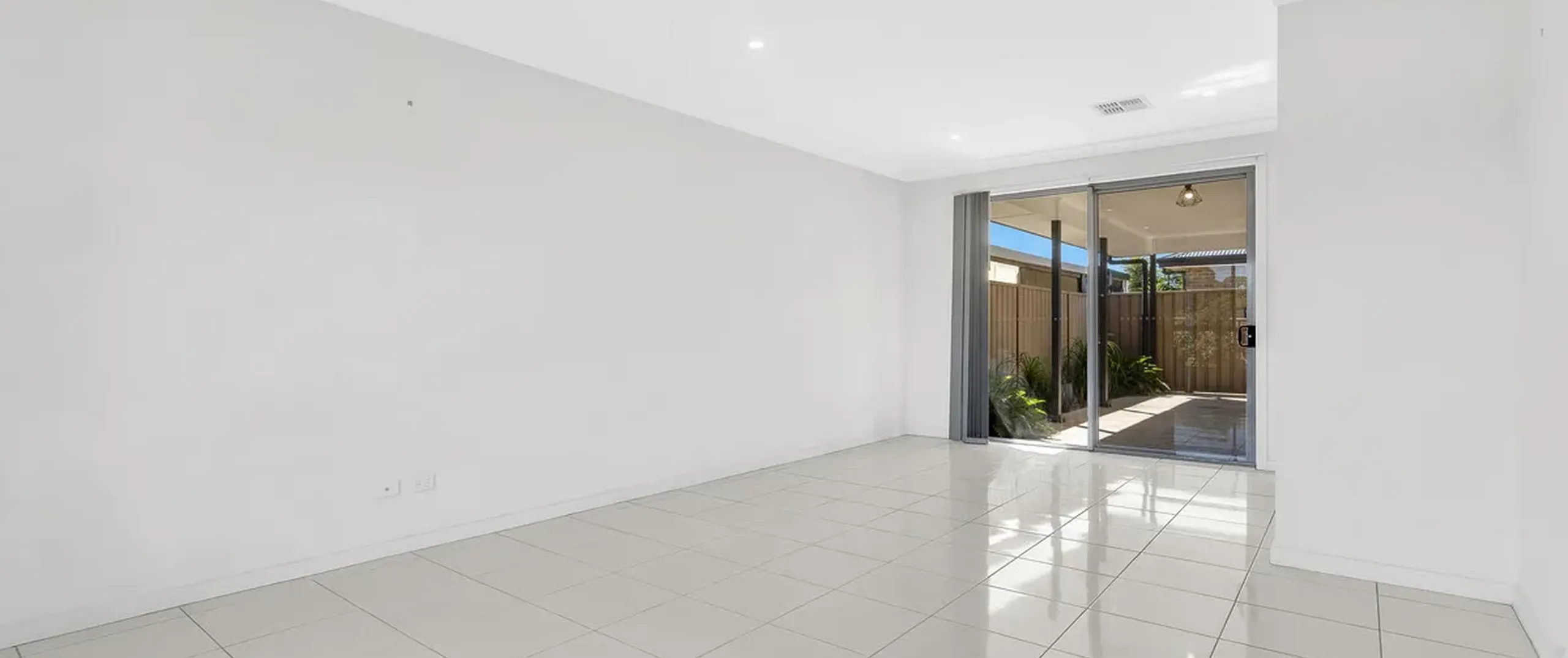 - Light-filled living area with downlights and glass sliding door opening to outdoor alfresco