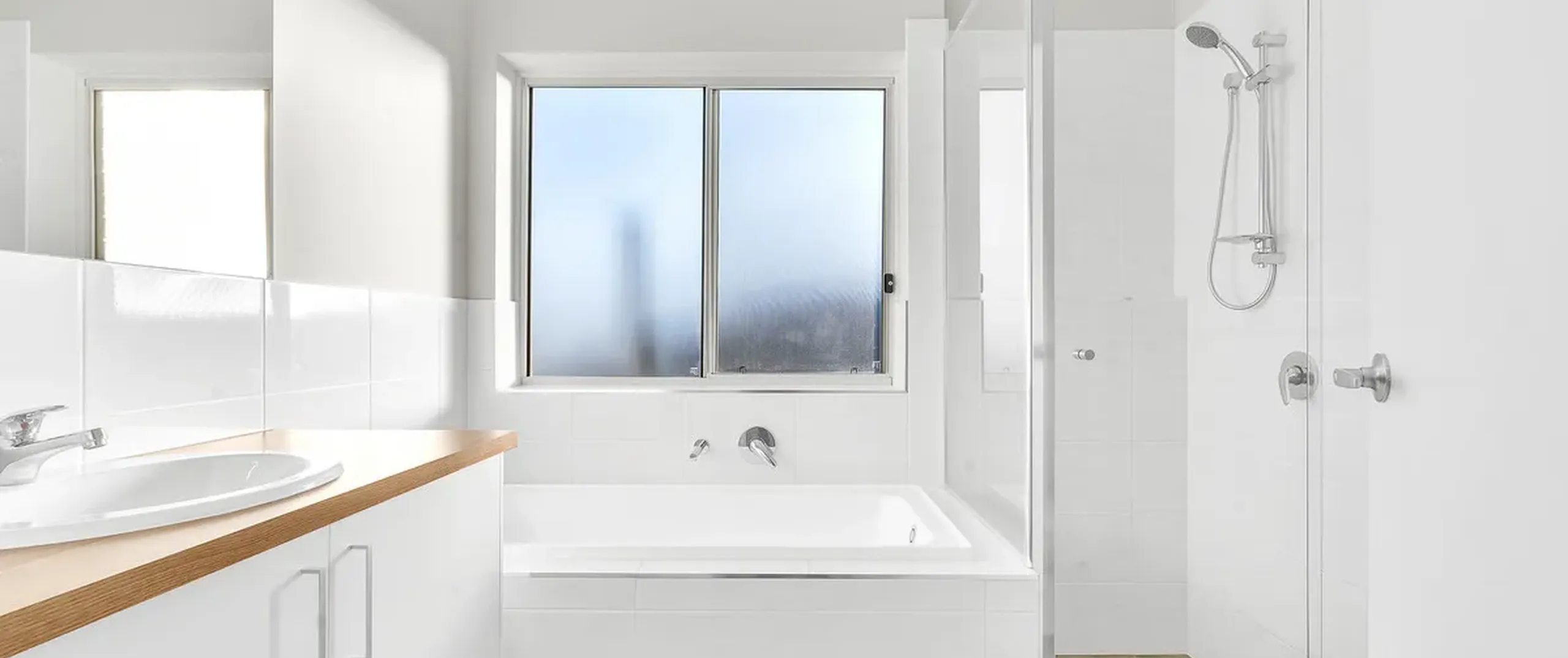 - Sparkling modern main bathroom with bath, shower, vanity and toilet