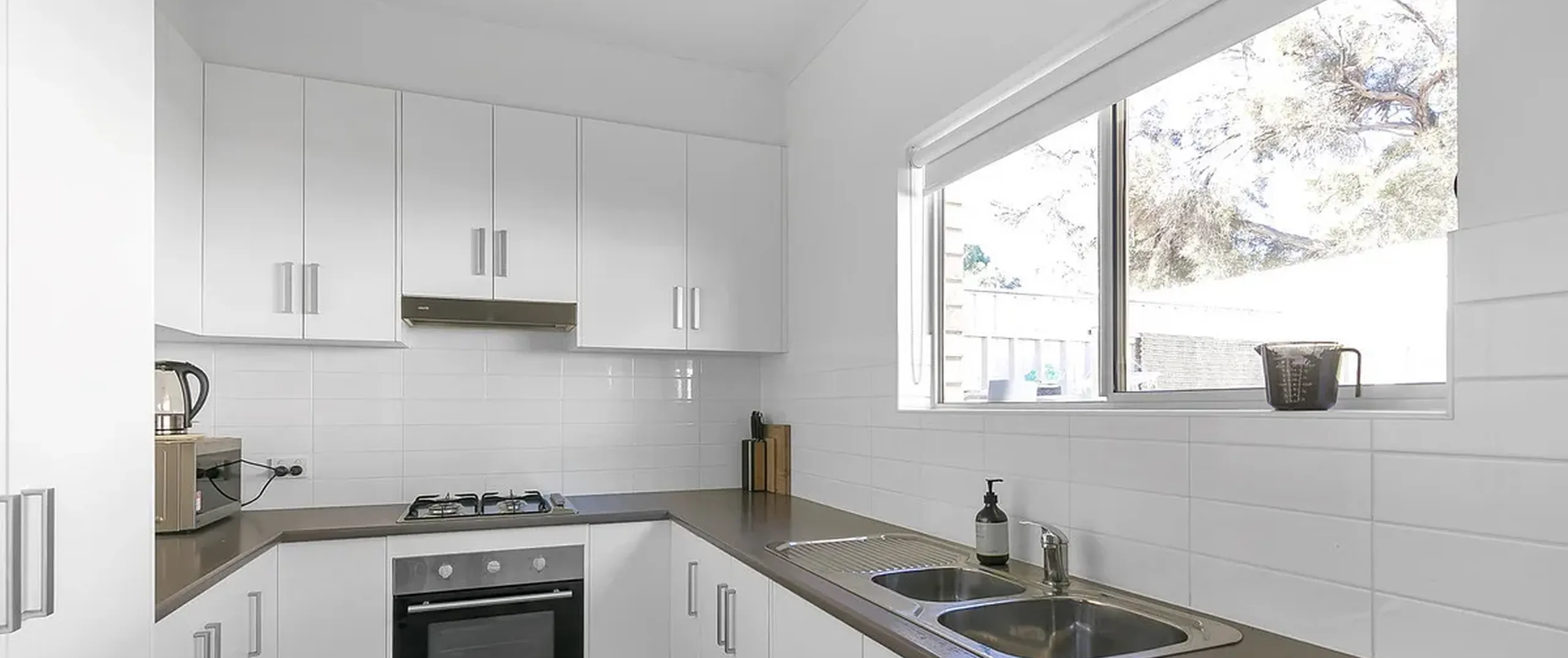 - Clean line styled kitchen with gas cooking and overlooking the rear yard