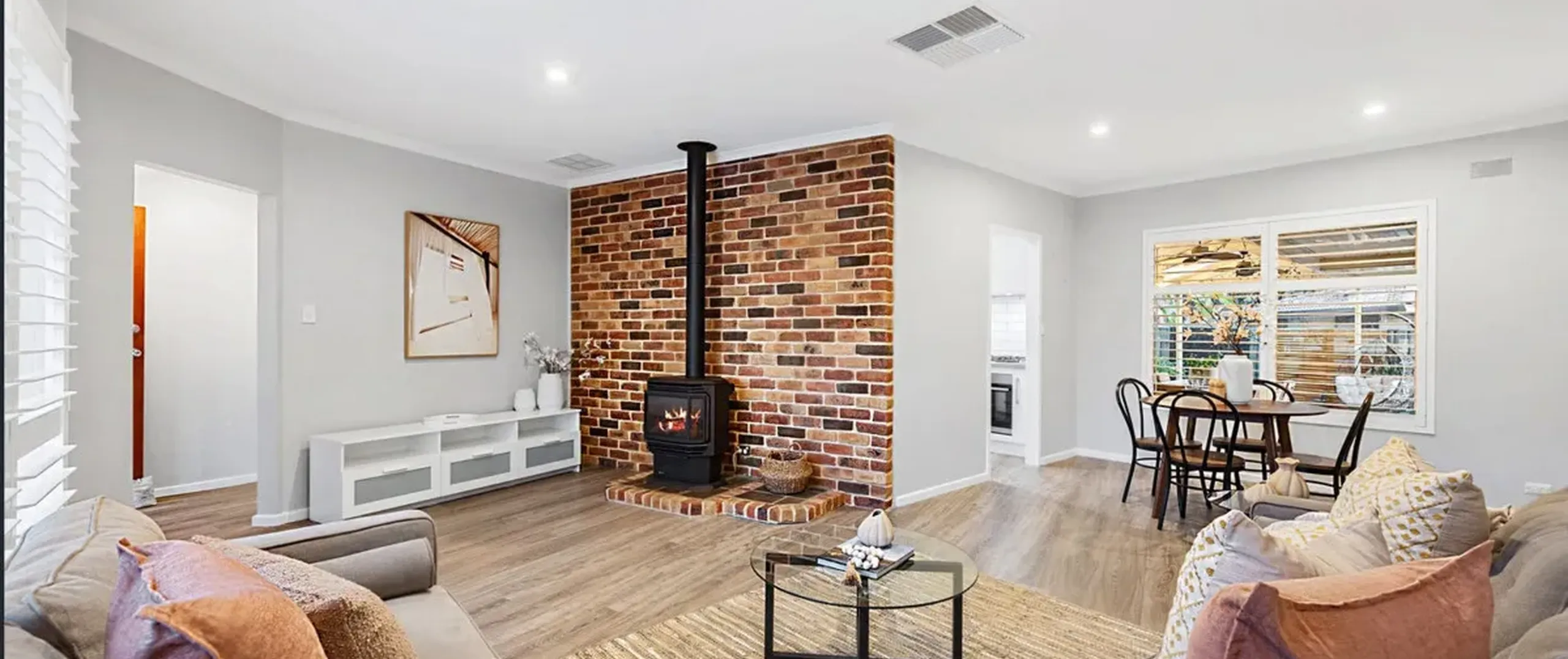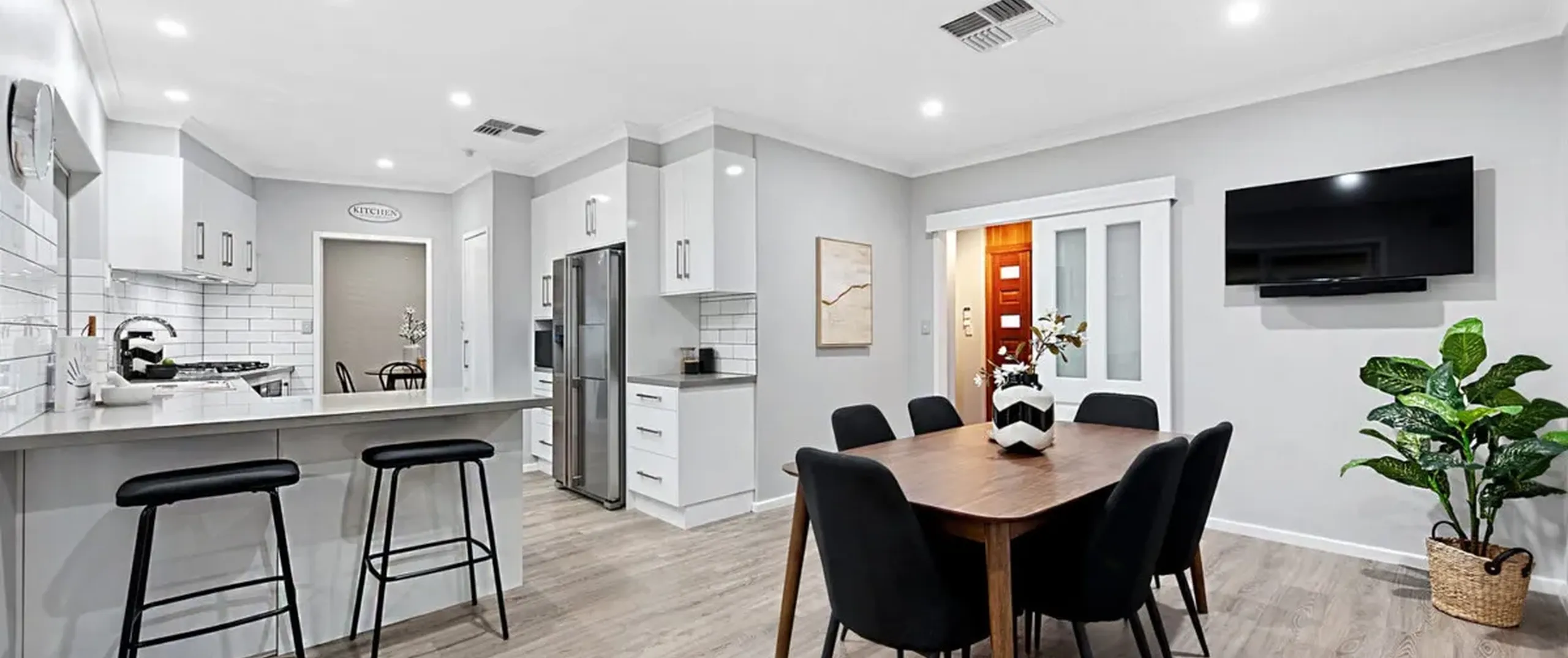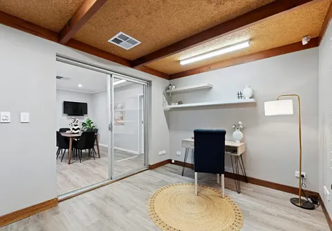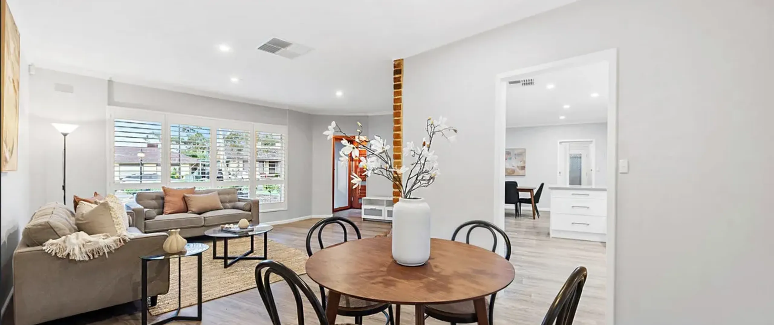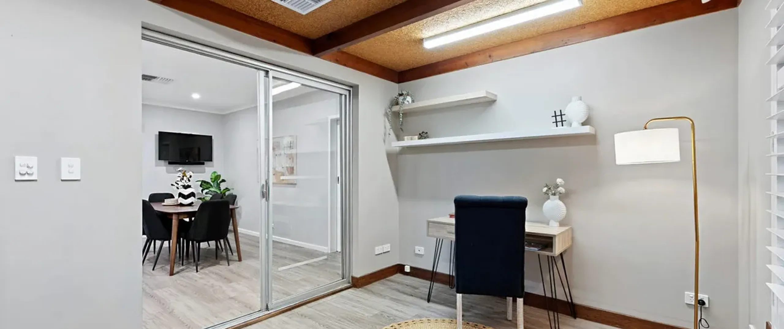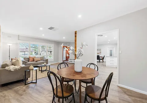 - Bright and spacious dining room with floating floorboard and external sliding doors to backyard