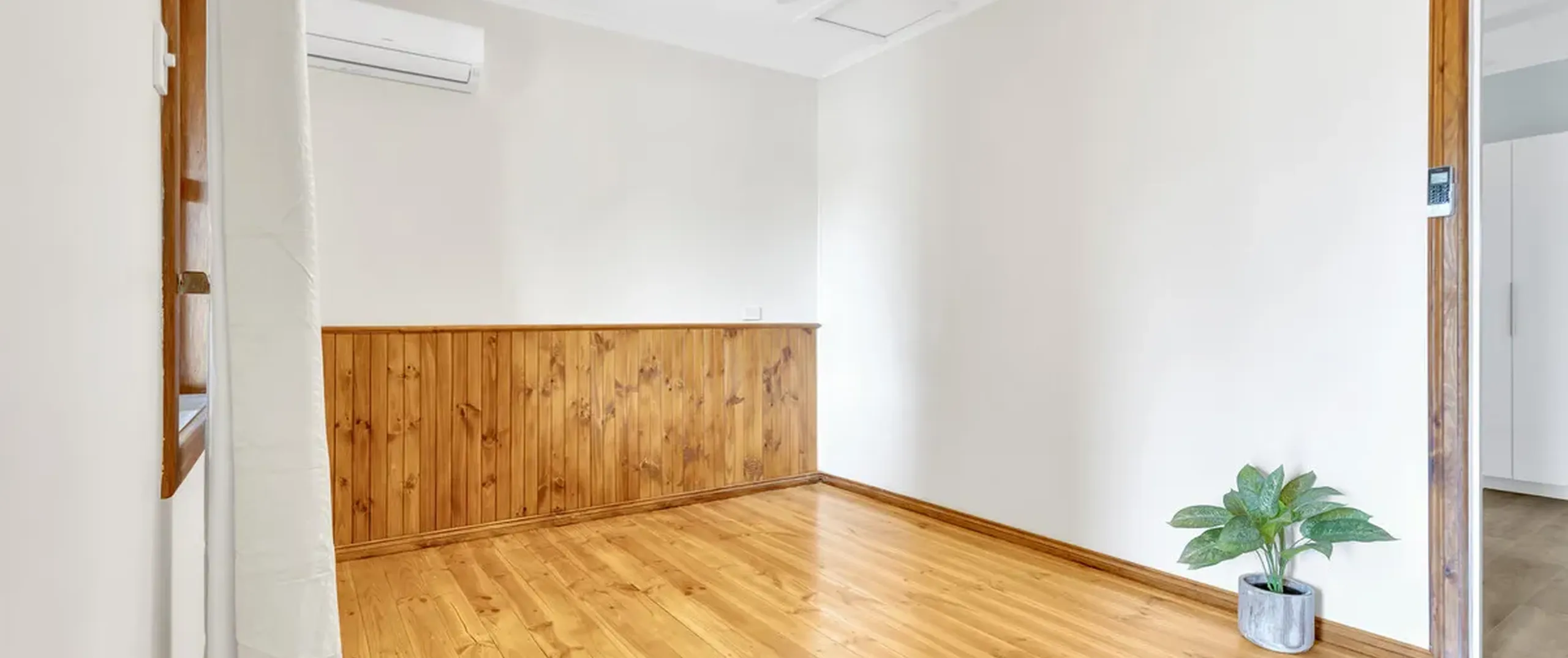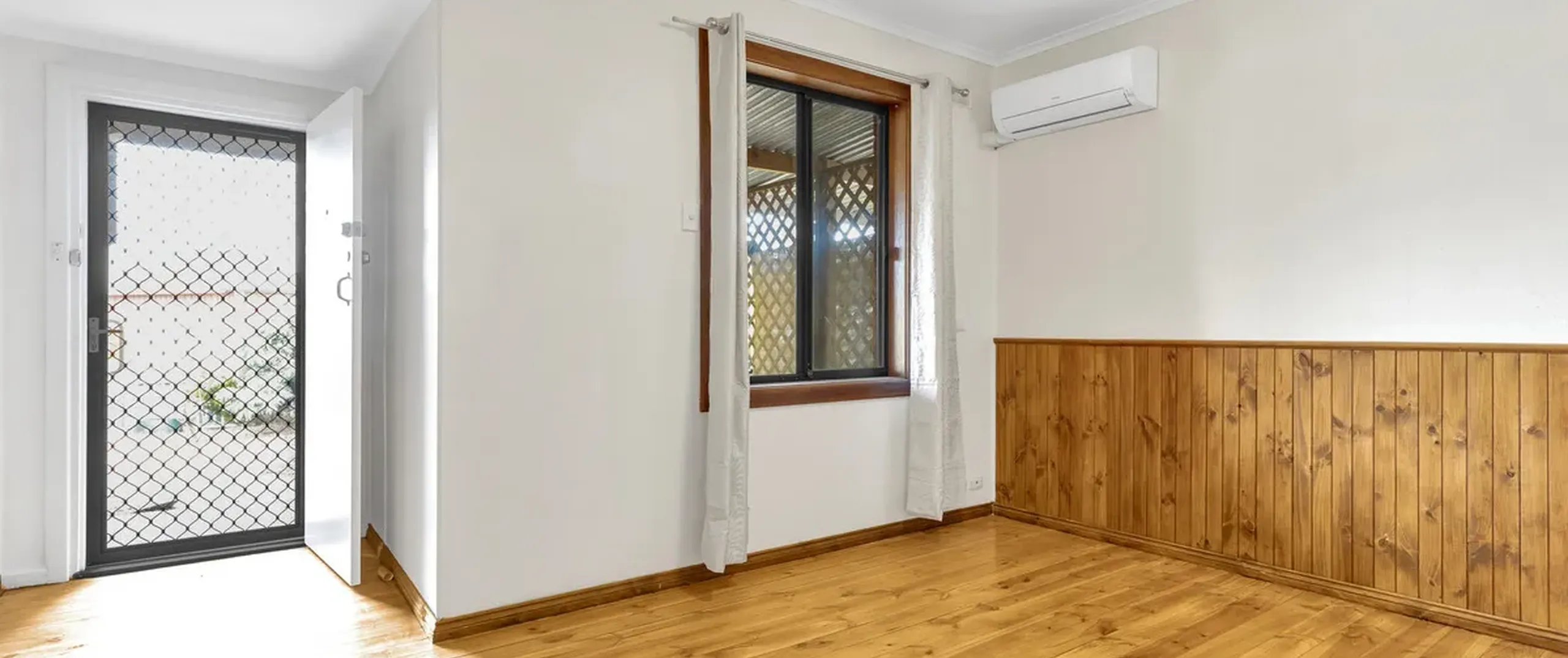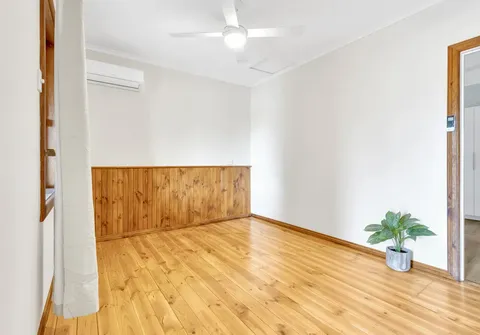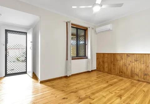 - Light filled living room with hardwood floorboards, split system wall unit and ceiling fan, seamlessly connecting to the dining room and kitchen