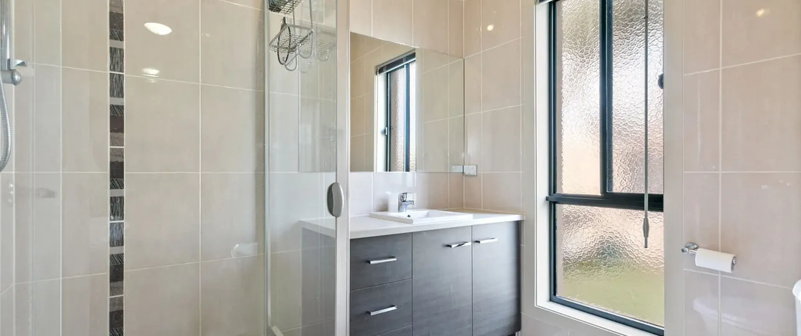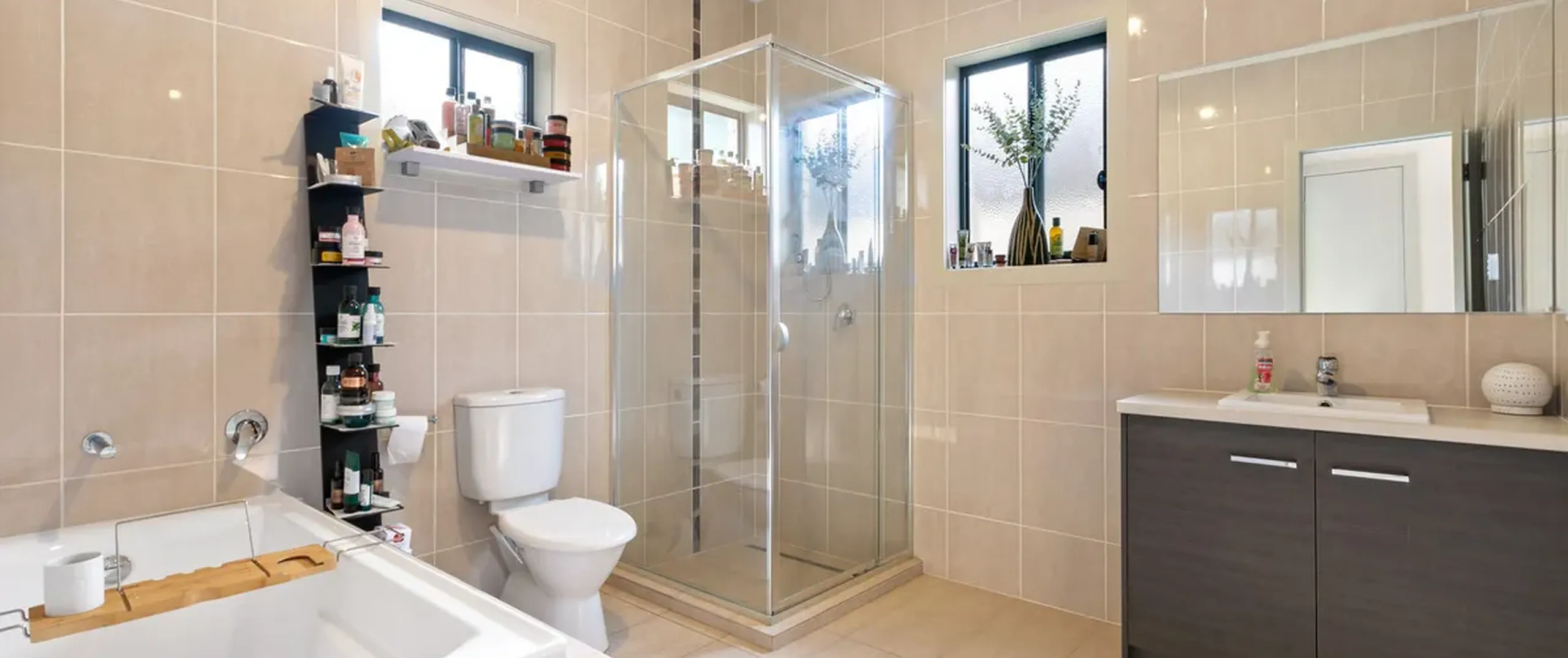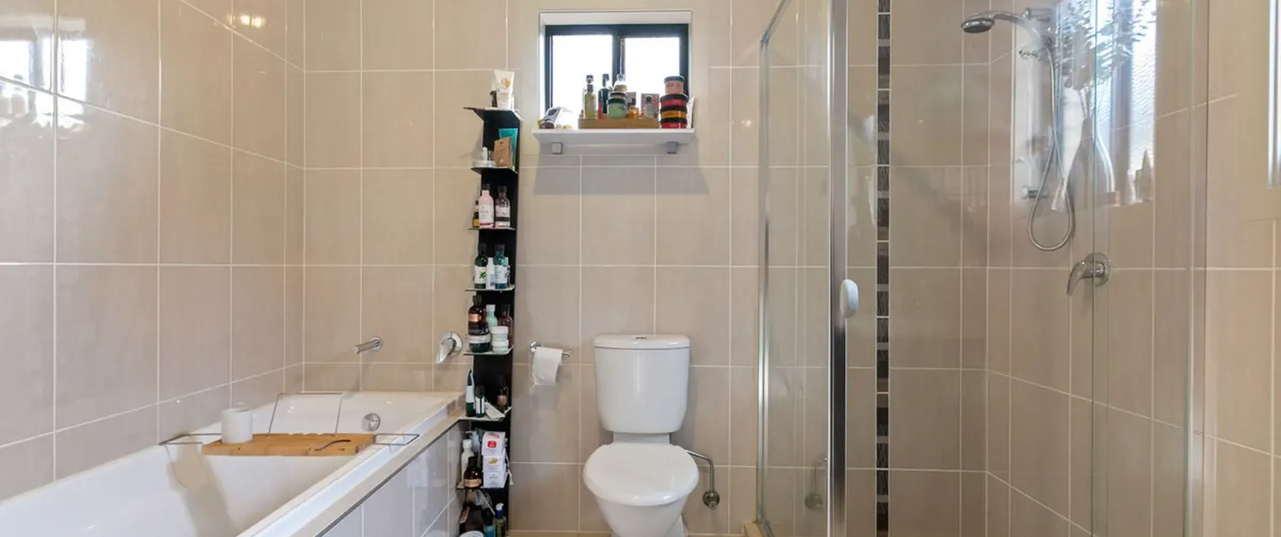 - Modern main bathroom with floor to ceiling tiles and separate bath and shower