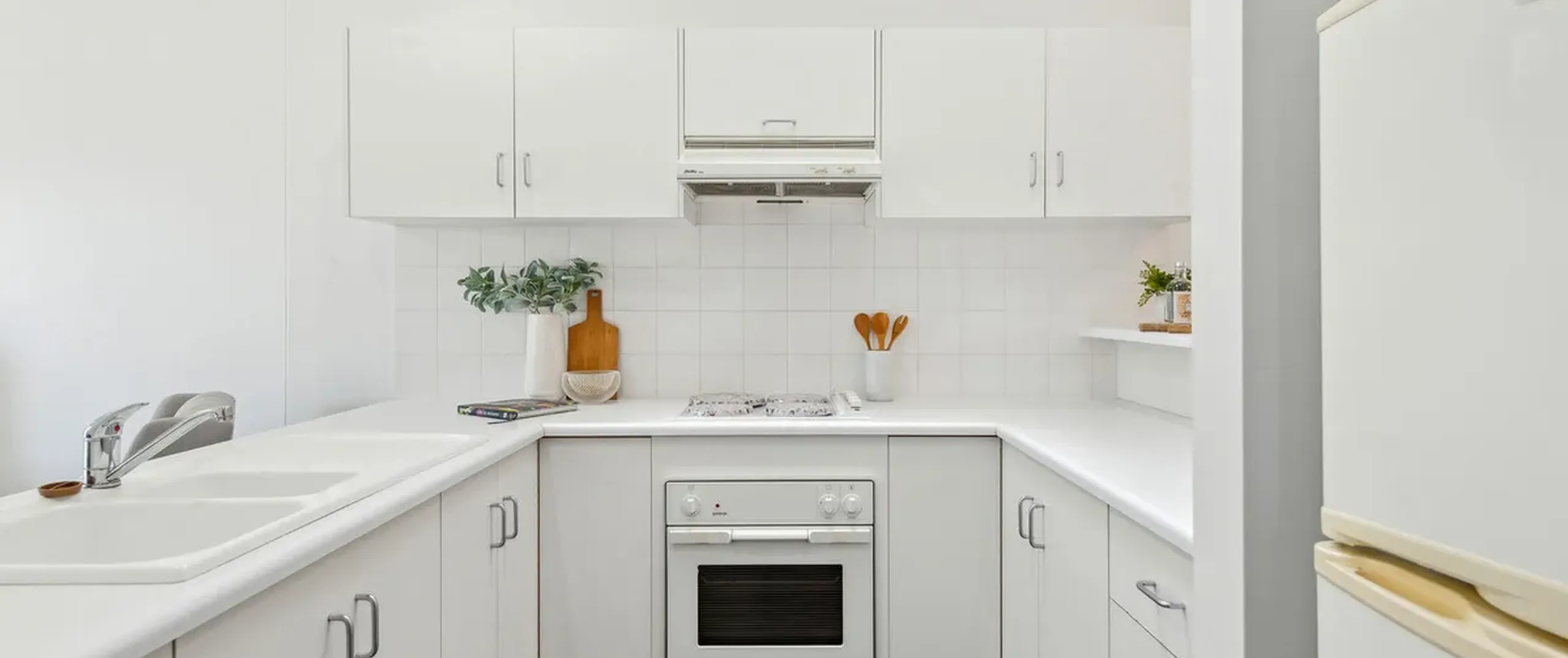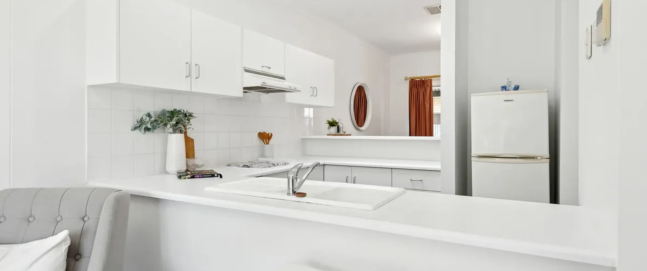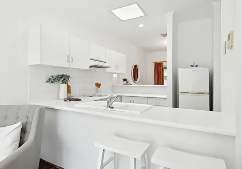 - Classic white kitchen equipped with cooktop, breakfast bar and ample cupboard and bench space