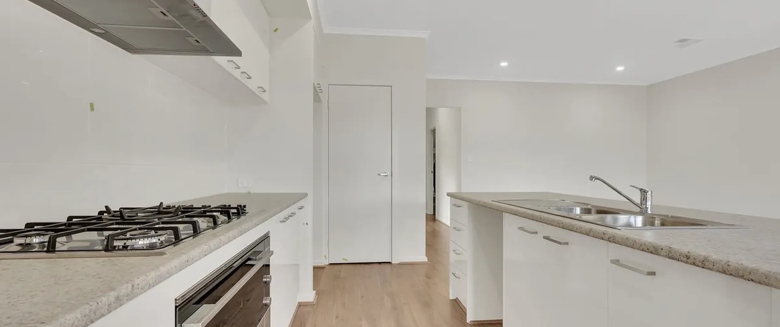 - Stylish and functional kitchen featuring gas cooktop, oven, range hood and ample storage space, breakfast bar and a walk-in pantry