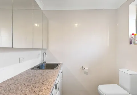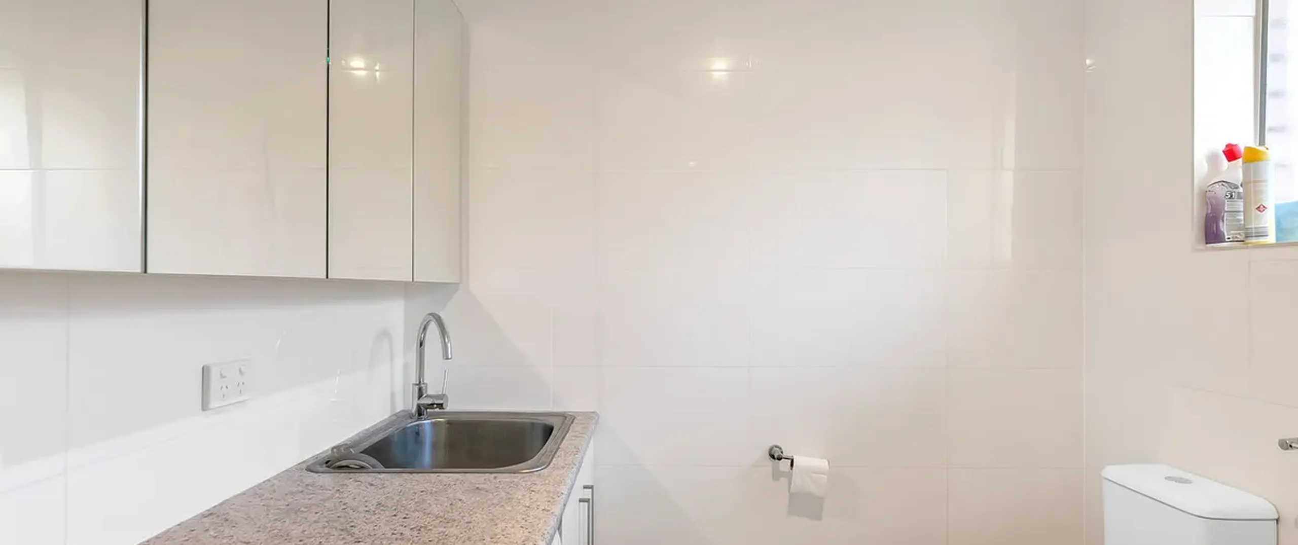 - Modern bathroom with concealed mirror storage and laundry facilities