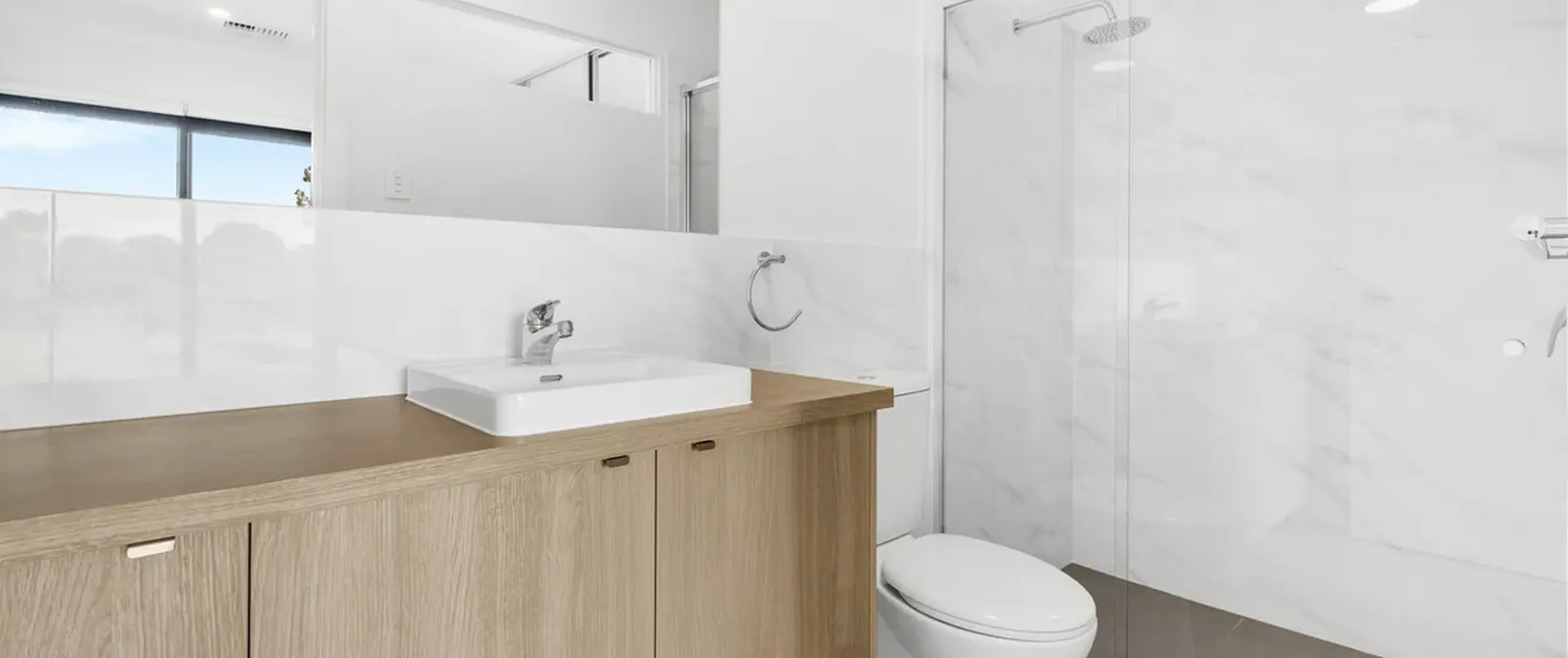 - Modern bathroom including shower with semi-frameless screen and a solar skylight