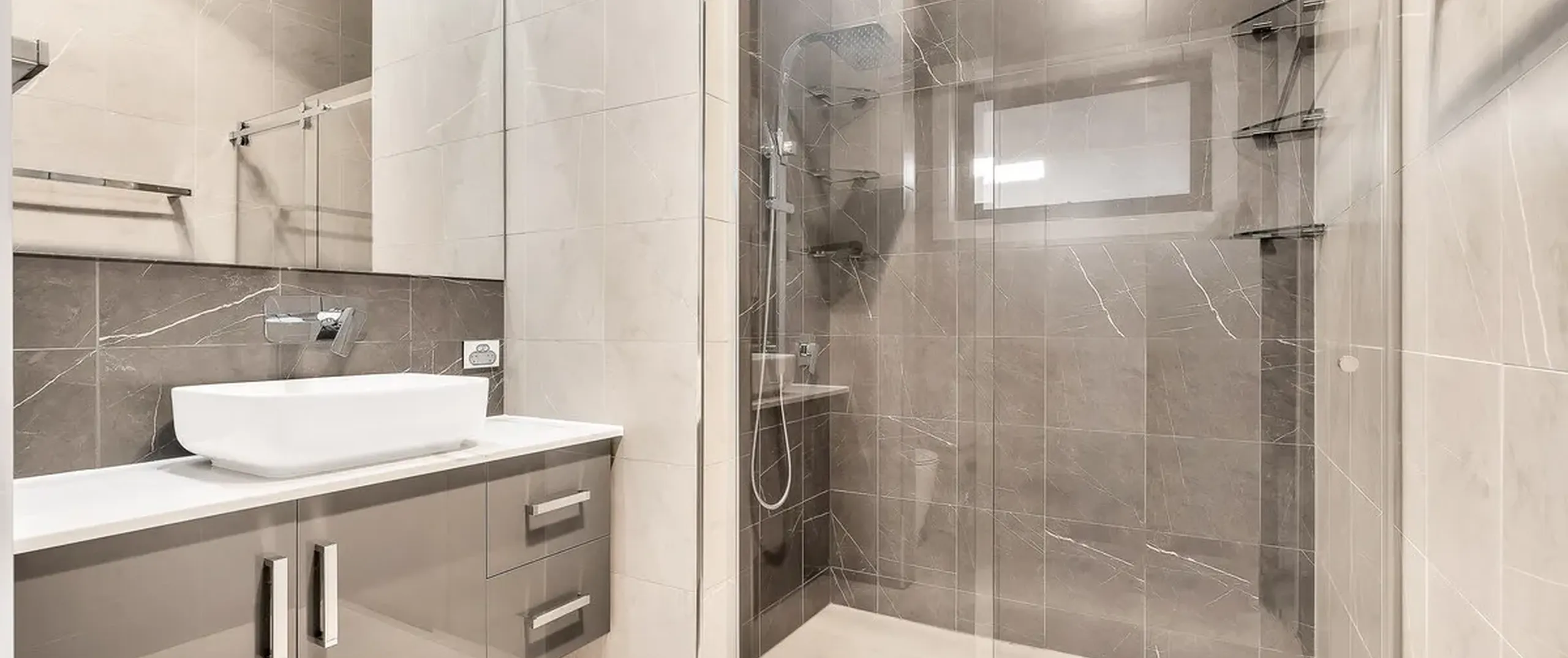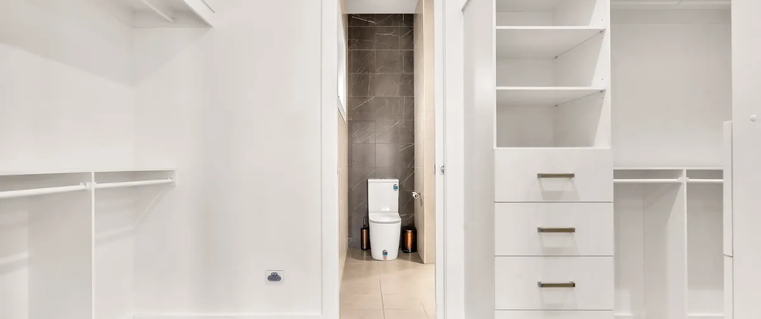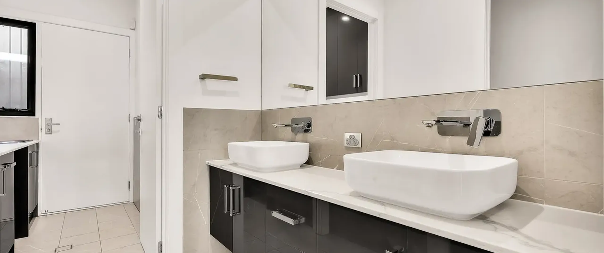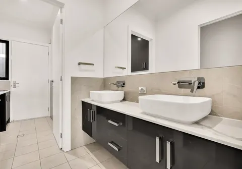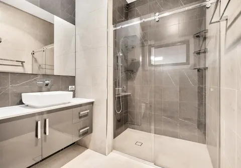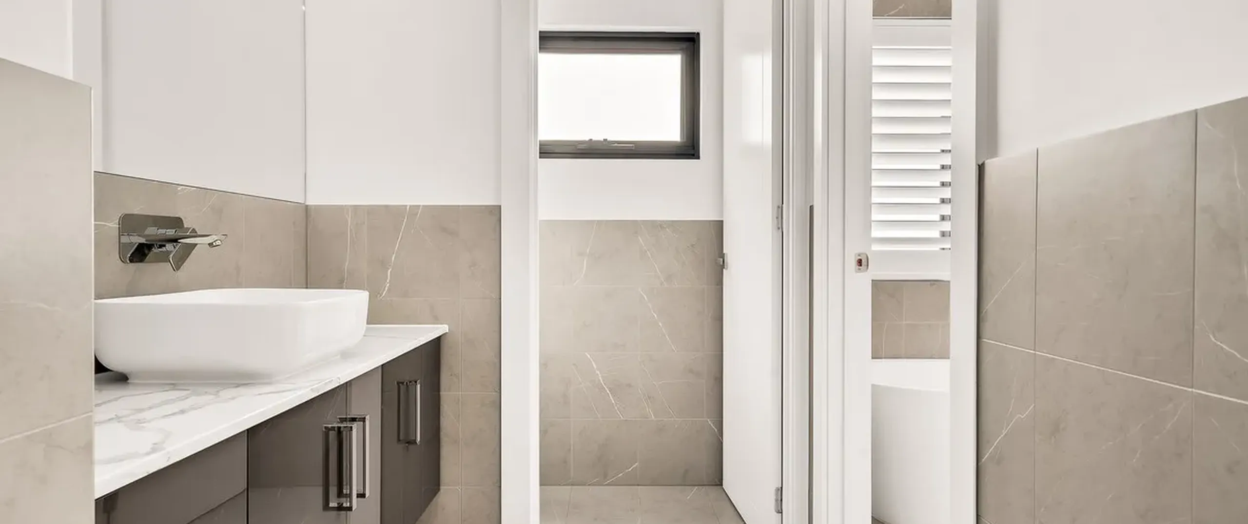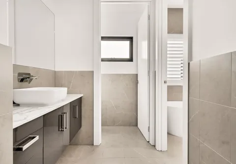 - Glistening ensuite with floor to ceiling tiles, semi frameless shower, separate toilet with large vanity and additional storage below