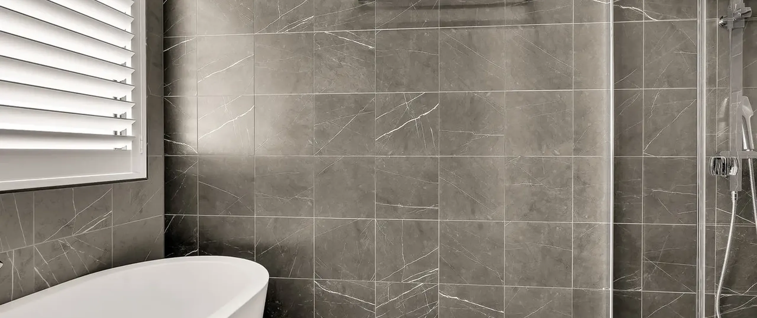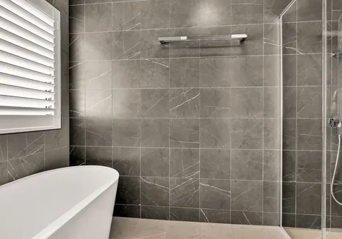 - Main bathroom with floor-to-ceiling tiles, free standing bath, semi frameless shower and separate toilet