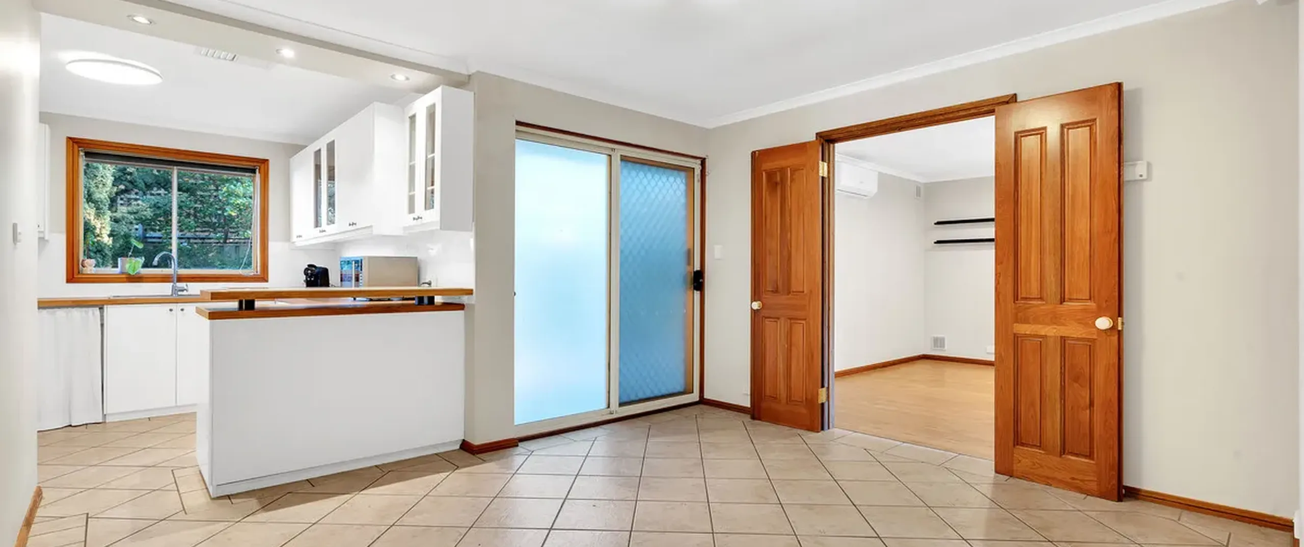 - Good sized tiled dining area seamlessly connects to the kitchen with double doors opening to the lounge room