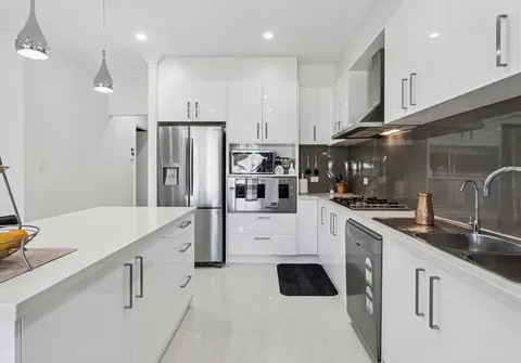 - Sleek and contemporary kitchen offering gas cooktop, stainless steel dishwasher and breakfast bar